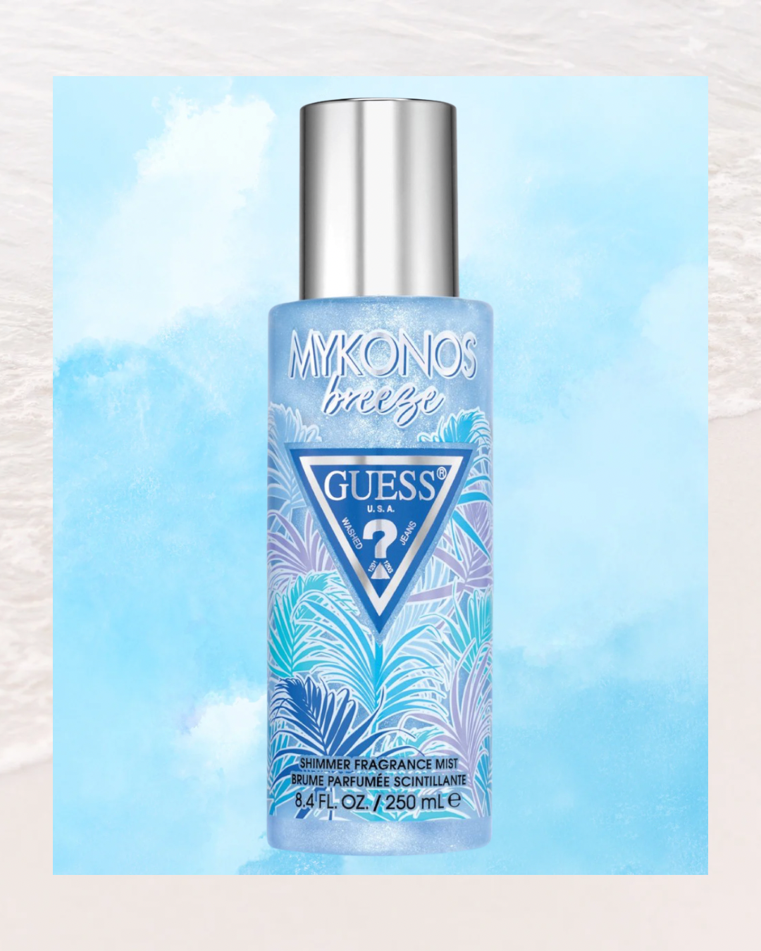 Mykonos Breeze Shimmer de Guess est un parfum frais et fruité parfait pour l'été. Cette brume corporelle a des notes de tête de poire, de mandarine et d'agrumes, des notes de coeur de sel de mer, de pastèque et d'eau, et des notes de fond d'ambre, de musc et de praliné. Mykonos Breeze a un éclat bleu nacré qui vous couvre d'un doux et fin scintillement.
